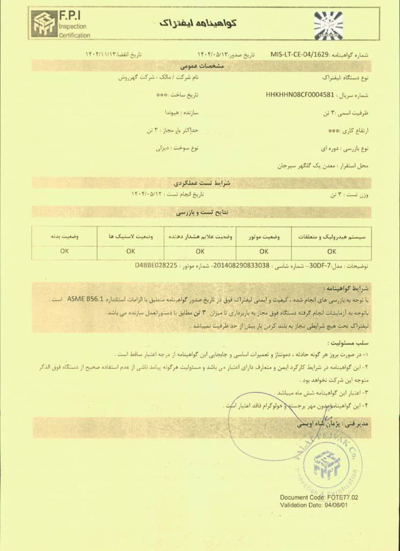 لیفتراک ۸۲۷ – ترانسپورت صنعتی لیفتراک ۳ تن - ۸۲۸ برای دانلود تصویر گواهی سلامت کلیک کنید گواهینامه ۰ روز ۰۰ ساعت ۰۰ دقیقه ۰۰ ثانیه